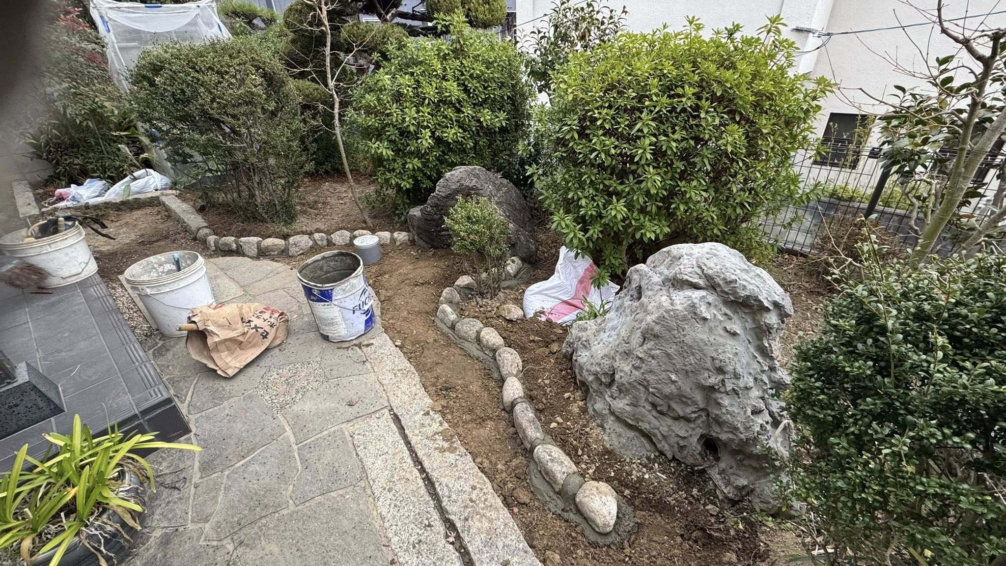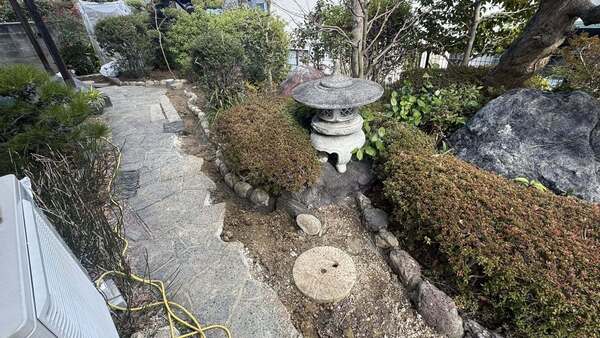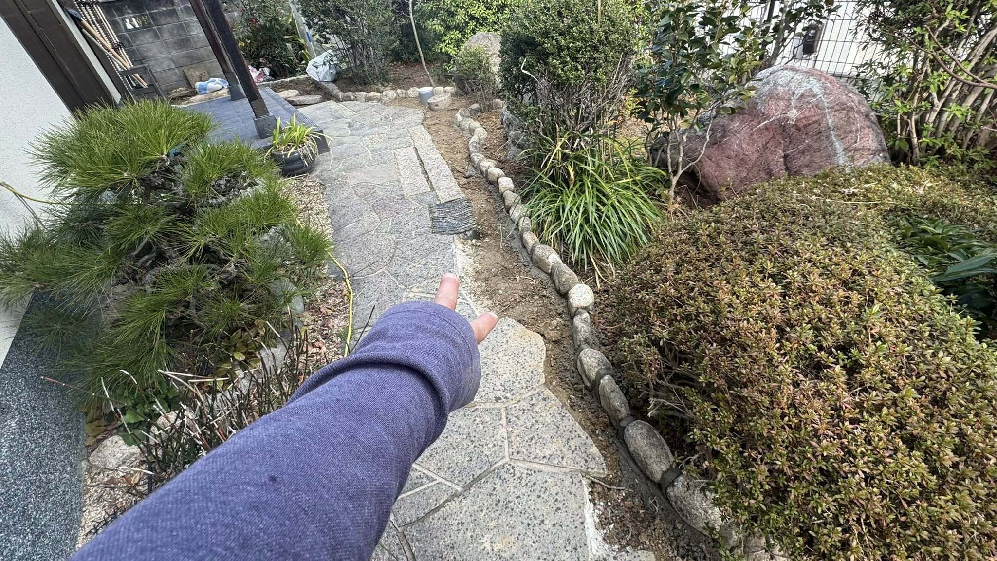 汚水管の根詰まりによる排水経路変更工事、迂回した配管付近の庭復旧工事。鉄平石乱張り通路と、庭との境の玉井見切り(玉石並べ)工事中です。