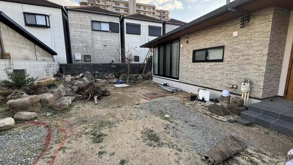 木造平屋建て新築に伴う外構・庭園工事着工(堺区) 2026.03.09 外構 堺区内の旧家で、住友林業で建て替えに伴う外構・新築工事を着工しました。初日は高さ関係の確認、現場での工事車両の駐車スペースの確保の為、埋まった石の掘り起こしなどをしましたが、〝♡型の飛石〟が出てきました。さあ、これをどう使うか閃きました。お楽しみに… PDFを開く