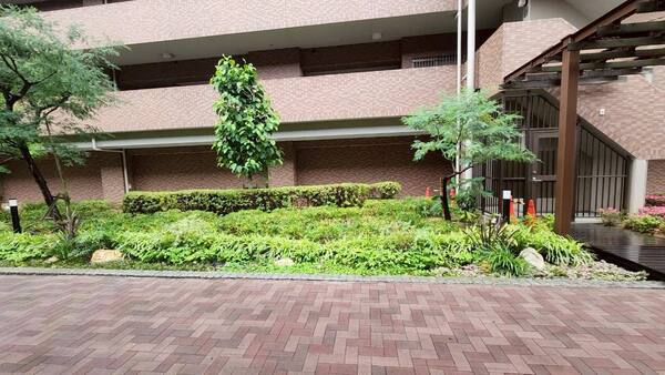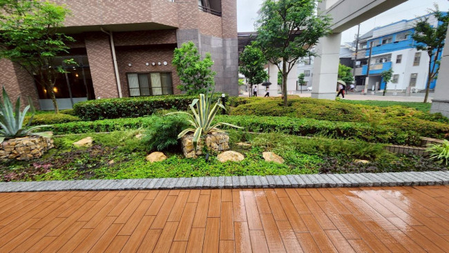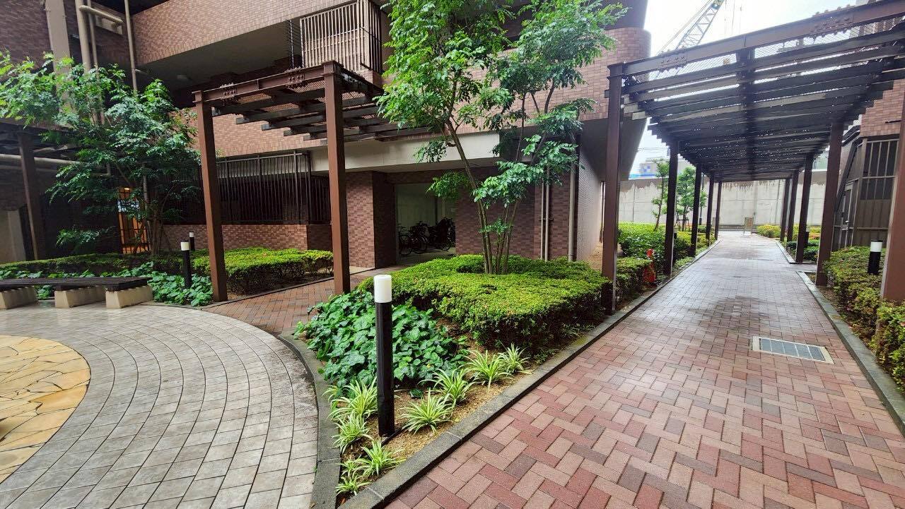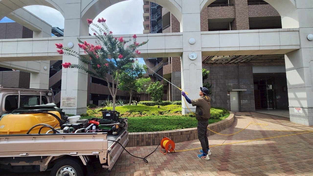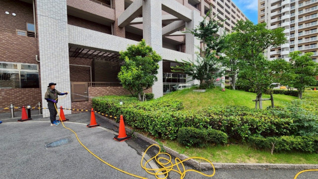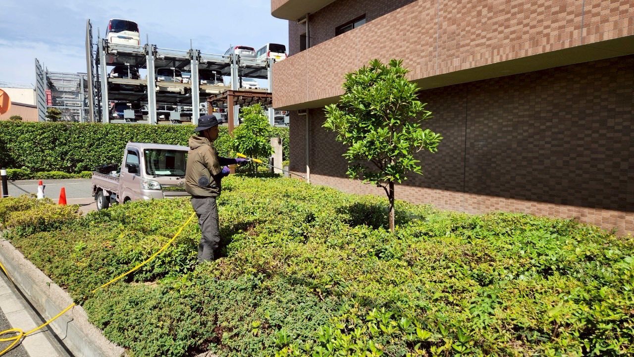 芝刈り・雑草除去と薬剤散布(タワマン植栽管理業務)