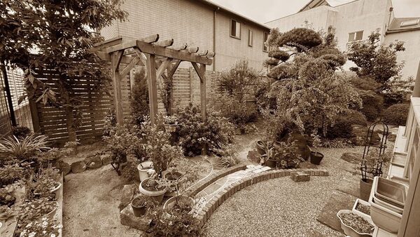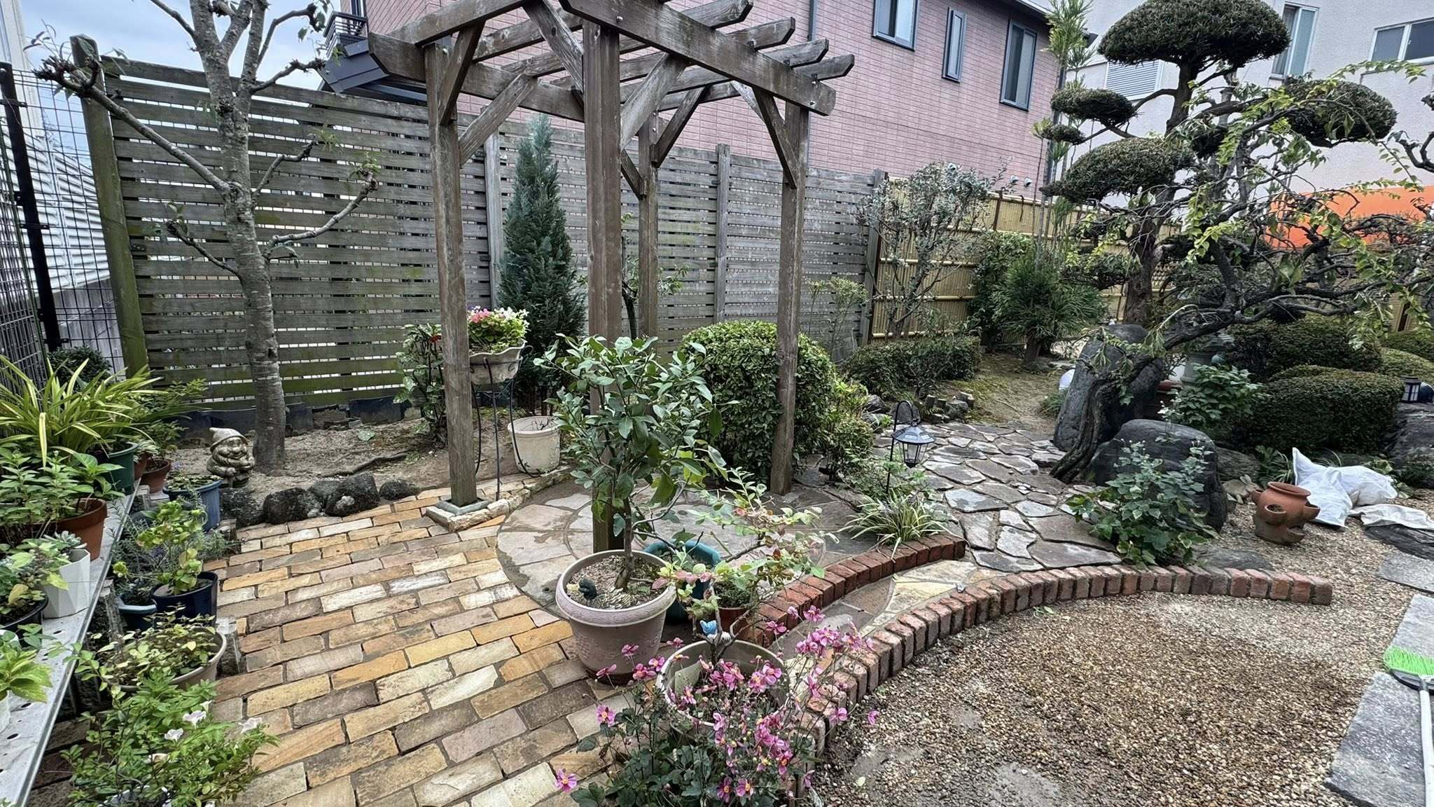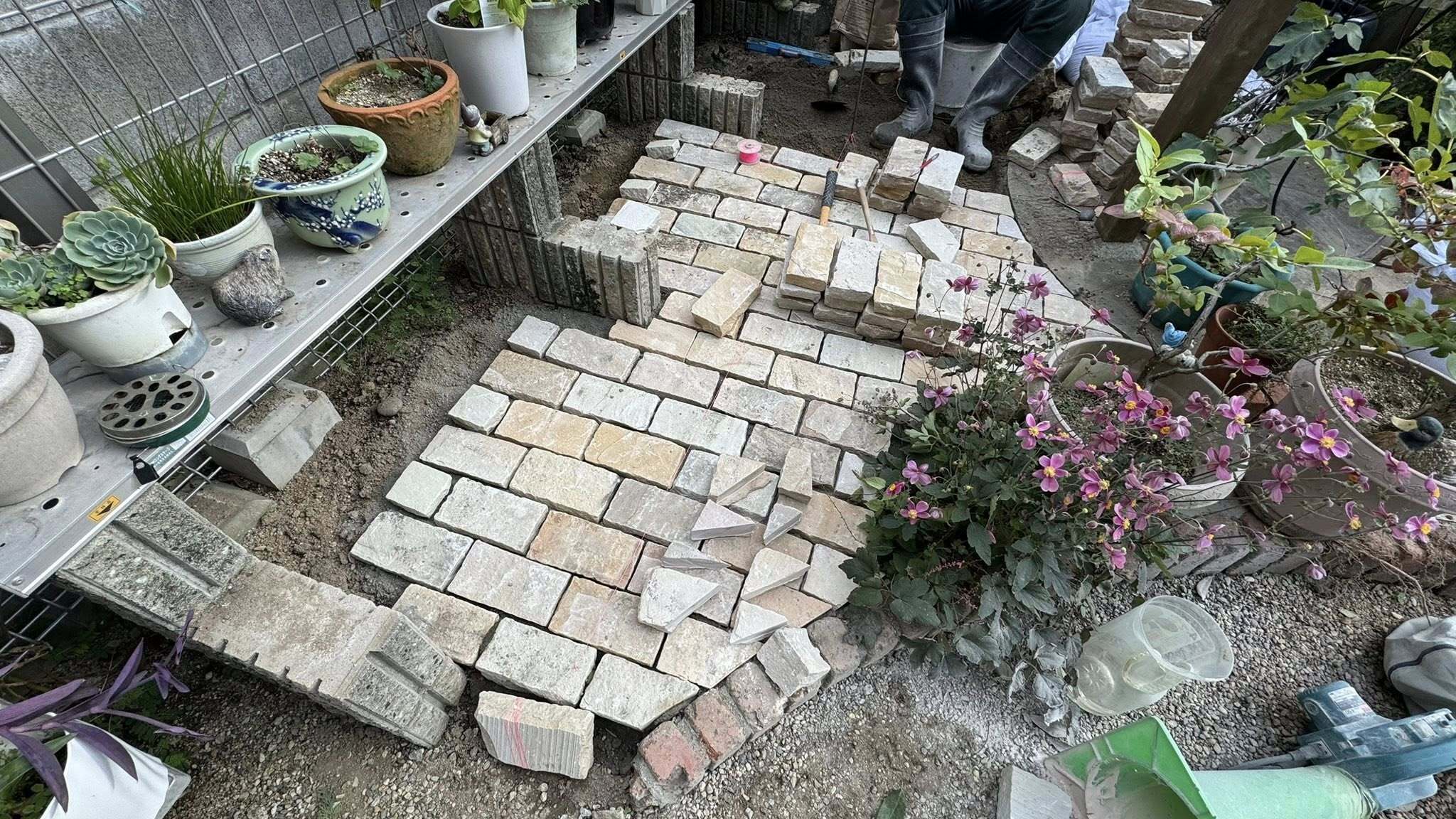 砂岩敷き(吹田市) 2025.10.10 造園 吹田市内の15年来のお客様、和洋分割の庭の石敷き工事。和風エリア(西半分)の蹲蹲の背景の竹垣裏のサビ御影板石(300×600×厚50)、和洋にをつなぐ乱形厚鉄平石敷きに続き、踞洋風エリアの砂岩サークルの東隣…砂岩の舗石(100×200×厚50)敷きです。 PDFを開く