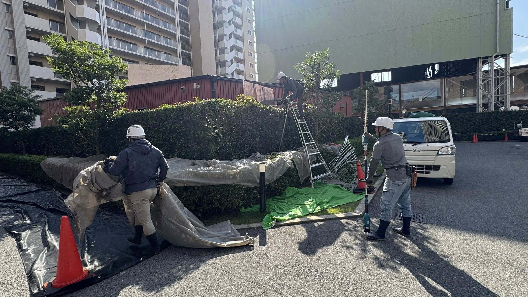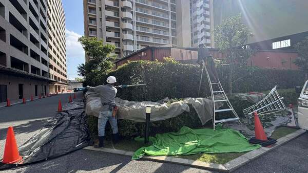 時折吹く海風・ビル風に剪定枝も飛ばされます。シートの養生を念入りにし、剪定枝の掃除の効率化に努めています。