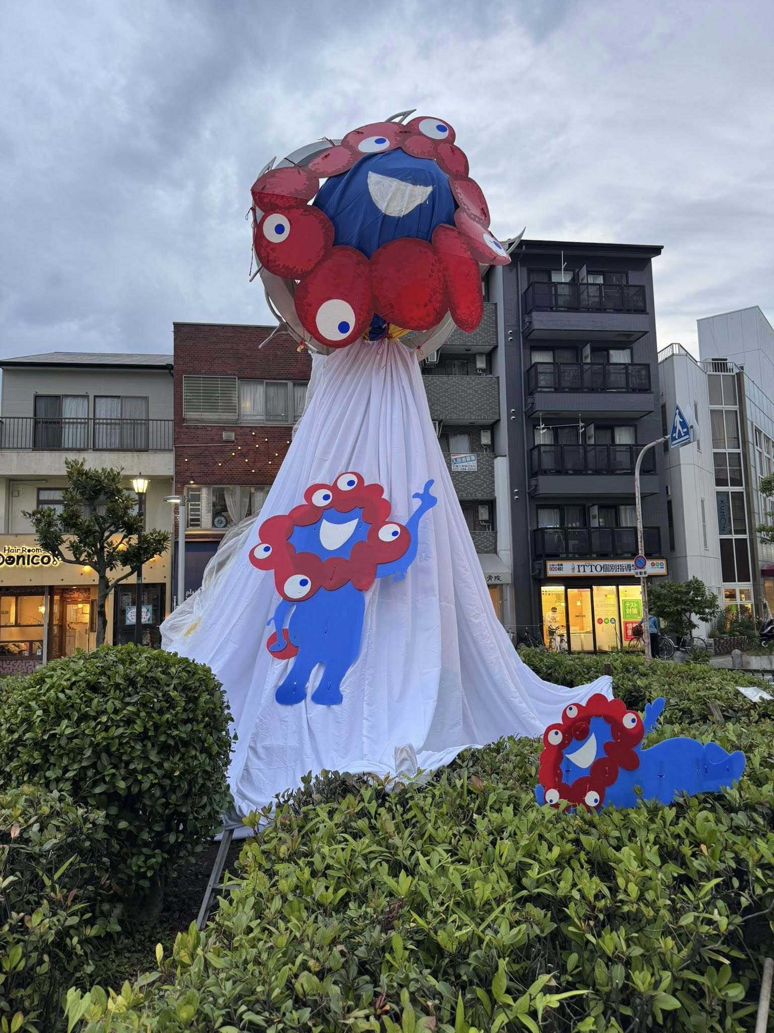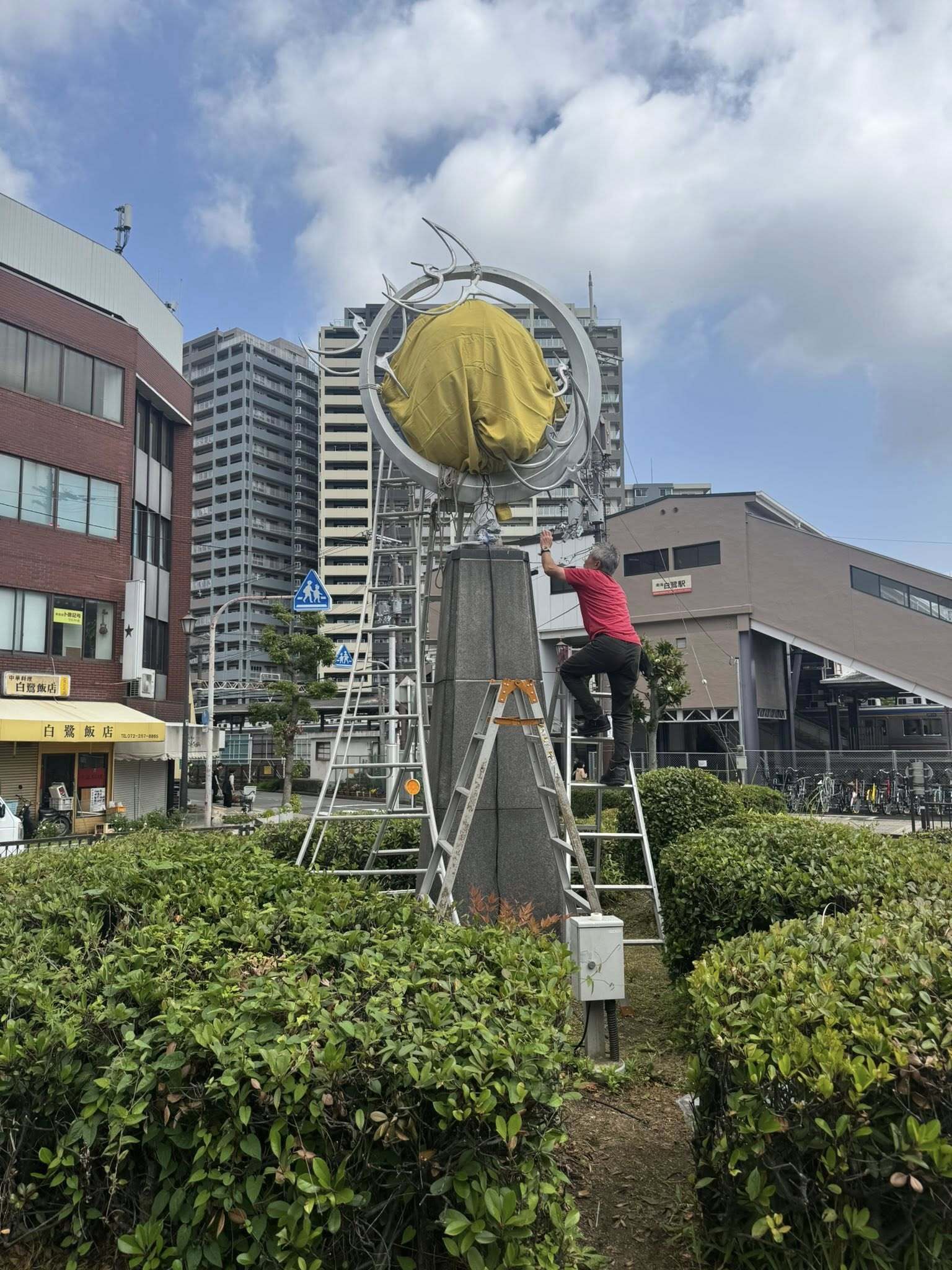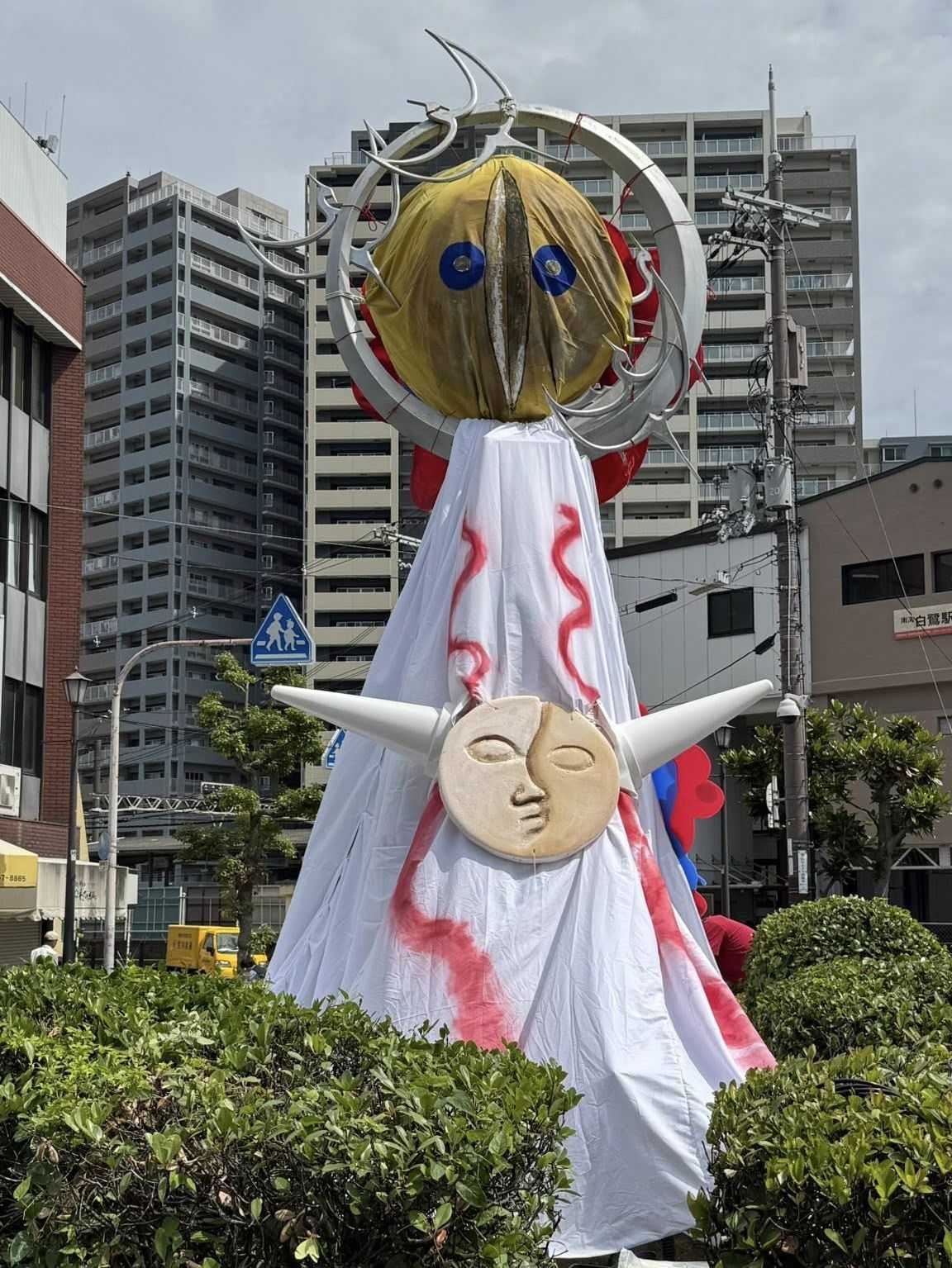 年に2回、6月と12月に商友会としてキャンペーンをしているのですが、6月は梅雨期であり、また地元堺の世界遺産の古墳が前方後円墳と〝てるてる坊主〟と似ているとの事で、駅前ロータリーのモニュメントをてるてる坊主のシンボルアートにしています。