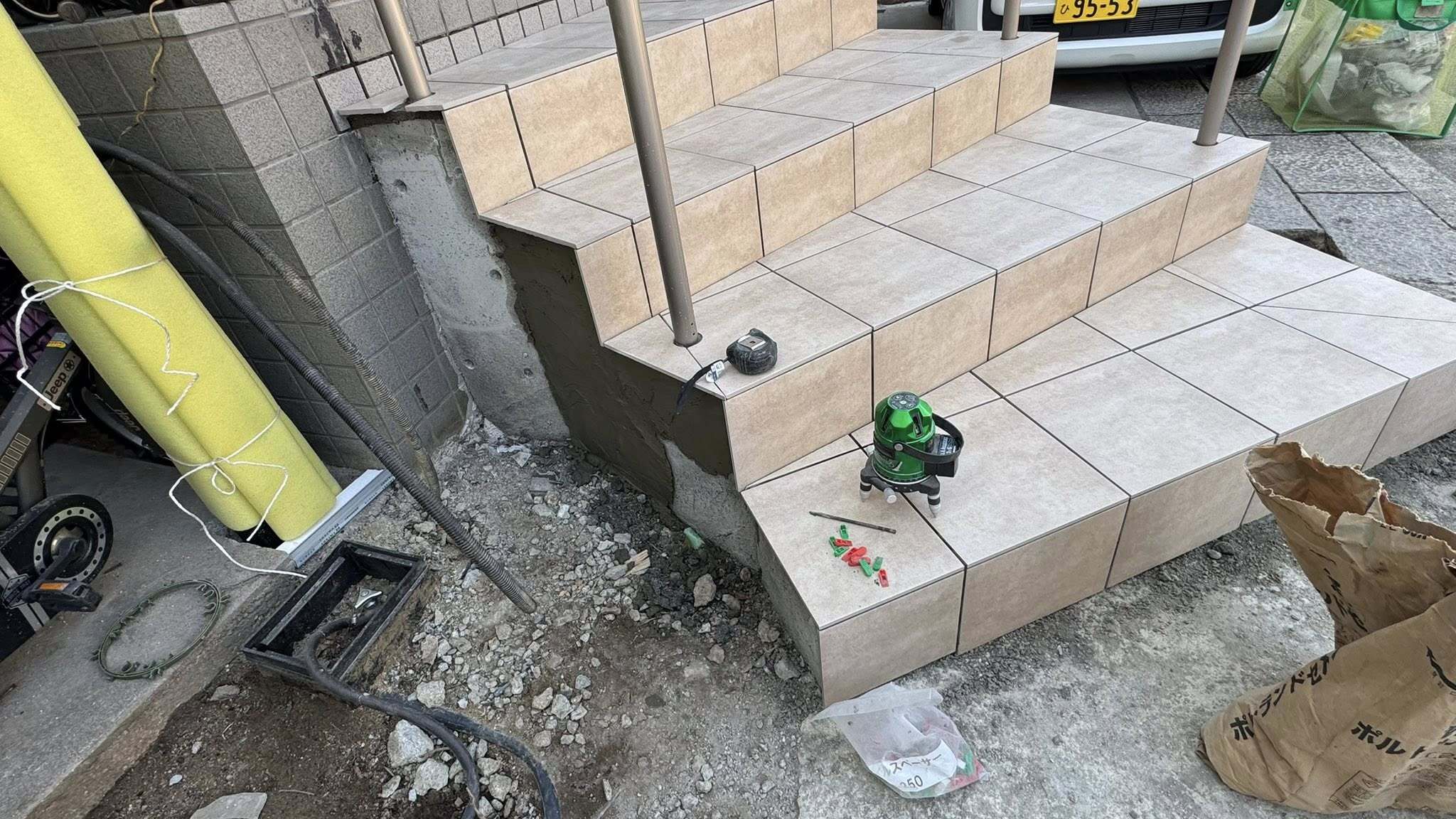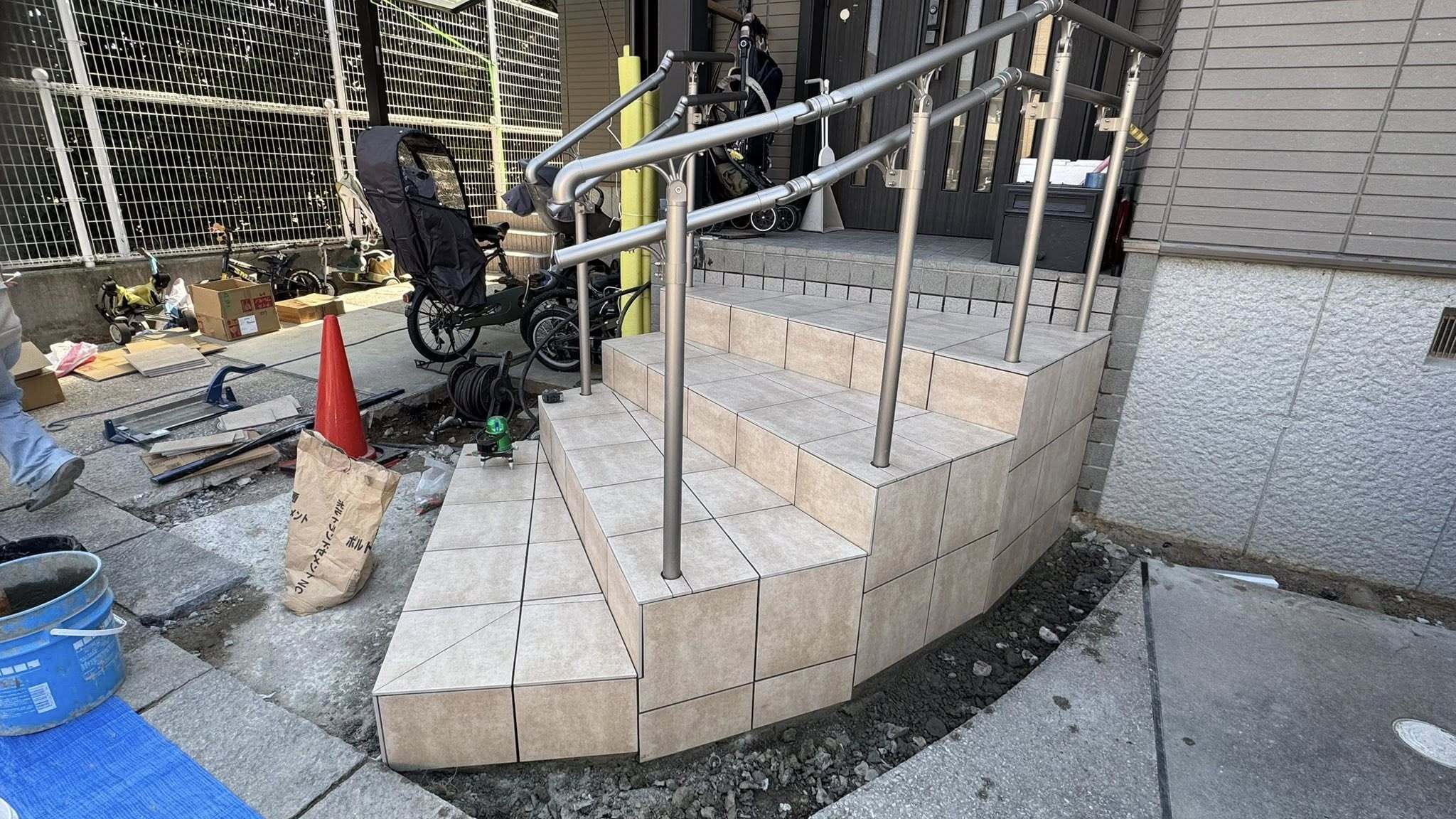 ポーチ階段の枕木を撤去し下地をコンクリートの増し打ちで拡幅。手摺を取付後に300角タイル張りします。