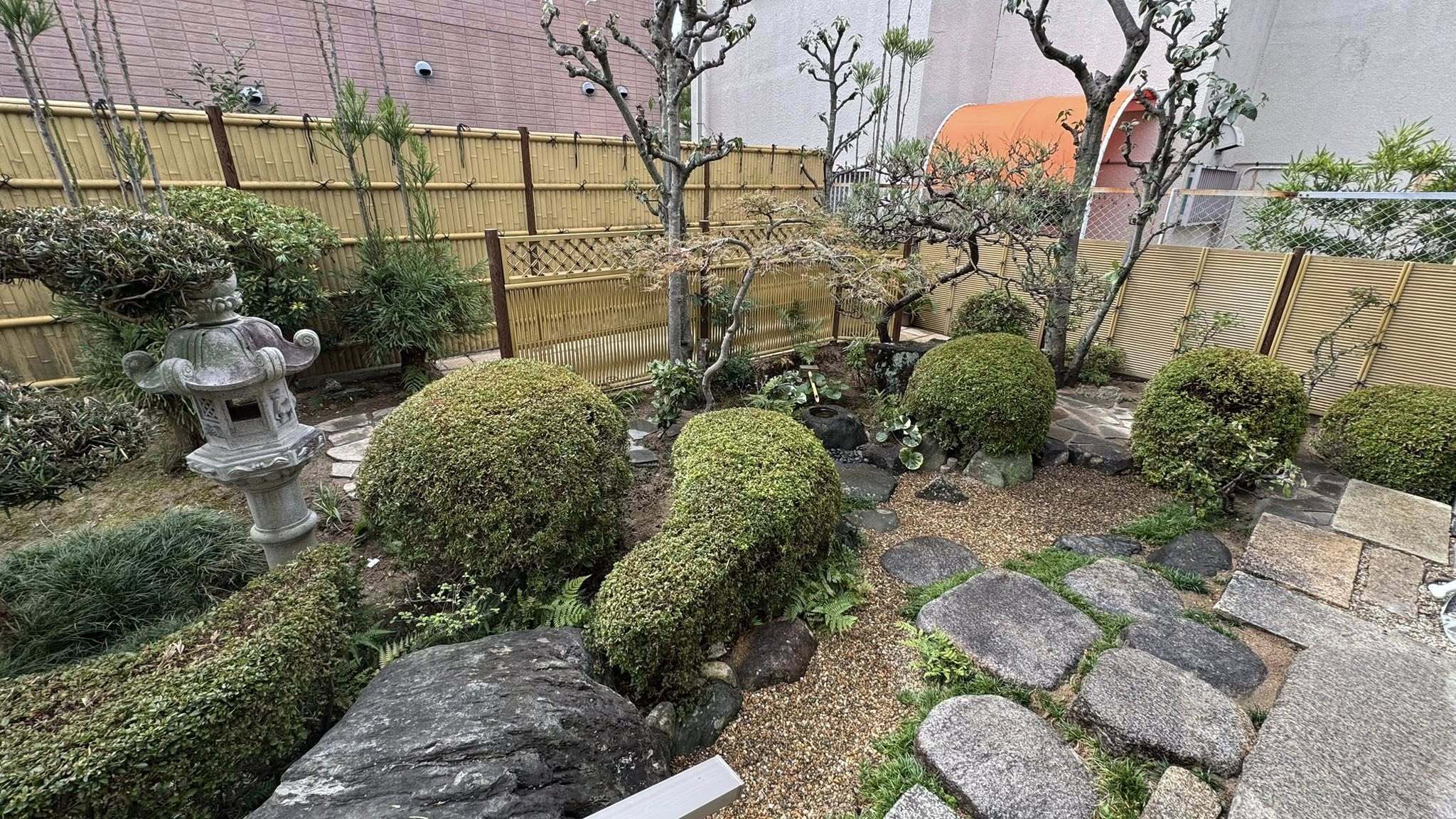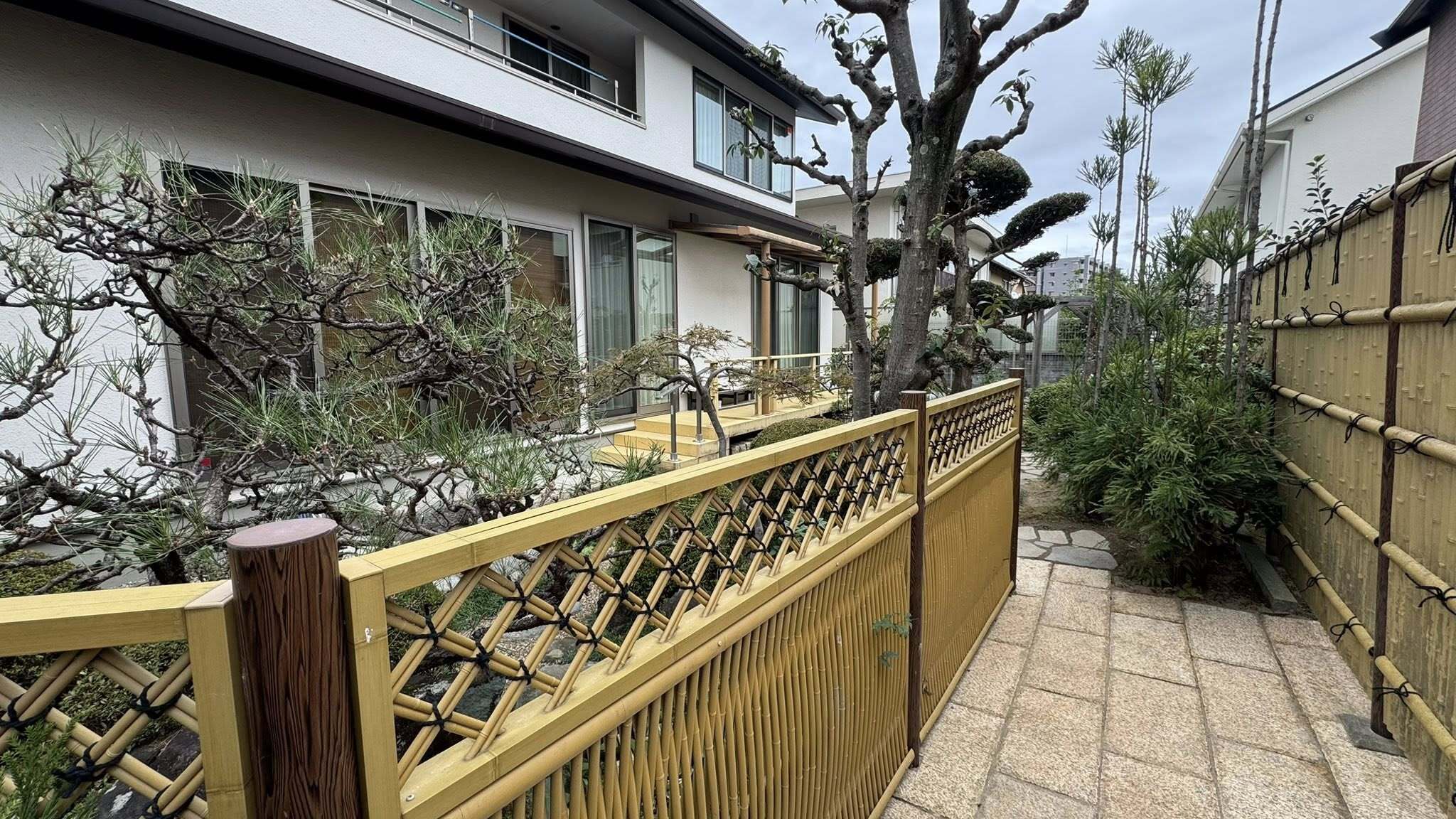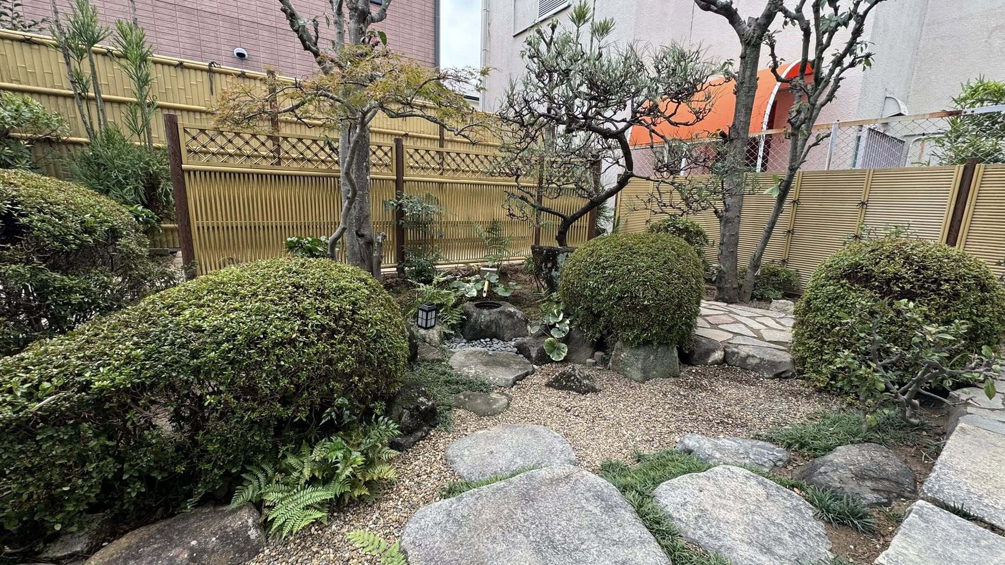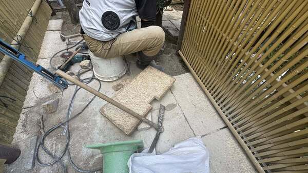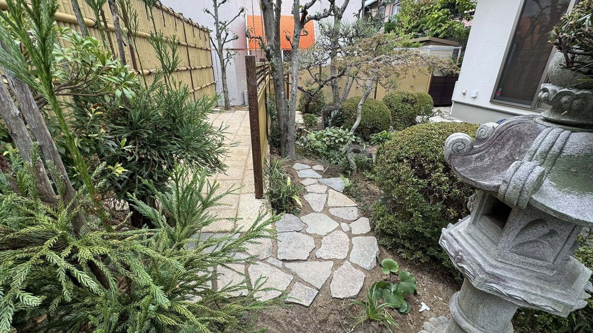 庭を和洋に分割するリフォーム工事を15年前以上目にお受けしお手から、庭園管理もさせていただいています。茶道を嗜まれており、毎年ご自宅で行われるお茶会前に少しづつお庭に手を加えられます。年々雑草引きが苦痛になってきたため、なるべく石敷きにするなどしてほしいとの要望です。蹲踞背景の大津垣と、背景の建仁寺垣の間の比較的平坦な部分をサビ御影の板石敷きにしました。板石部分に接続する部分は勾配がついているため、乱形の極厚の鉄平石敷きで庭を勾配なりに仕上げました。いづれもパサモル下地の眠り目地にして雨水を浸透しやすいようにしています。(パサモル下地:セメントと砂を空練りした上に石を敷くため、目地から雨水が浸透しやすくなります。)