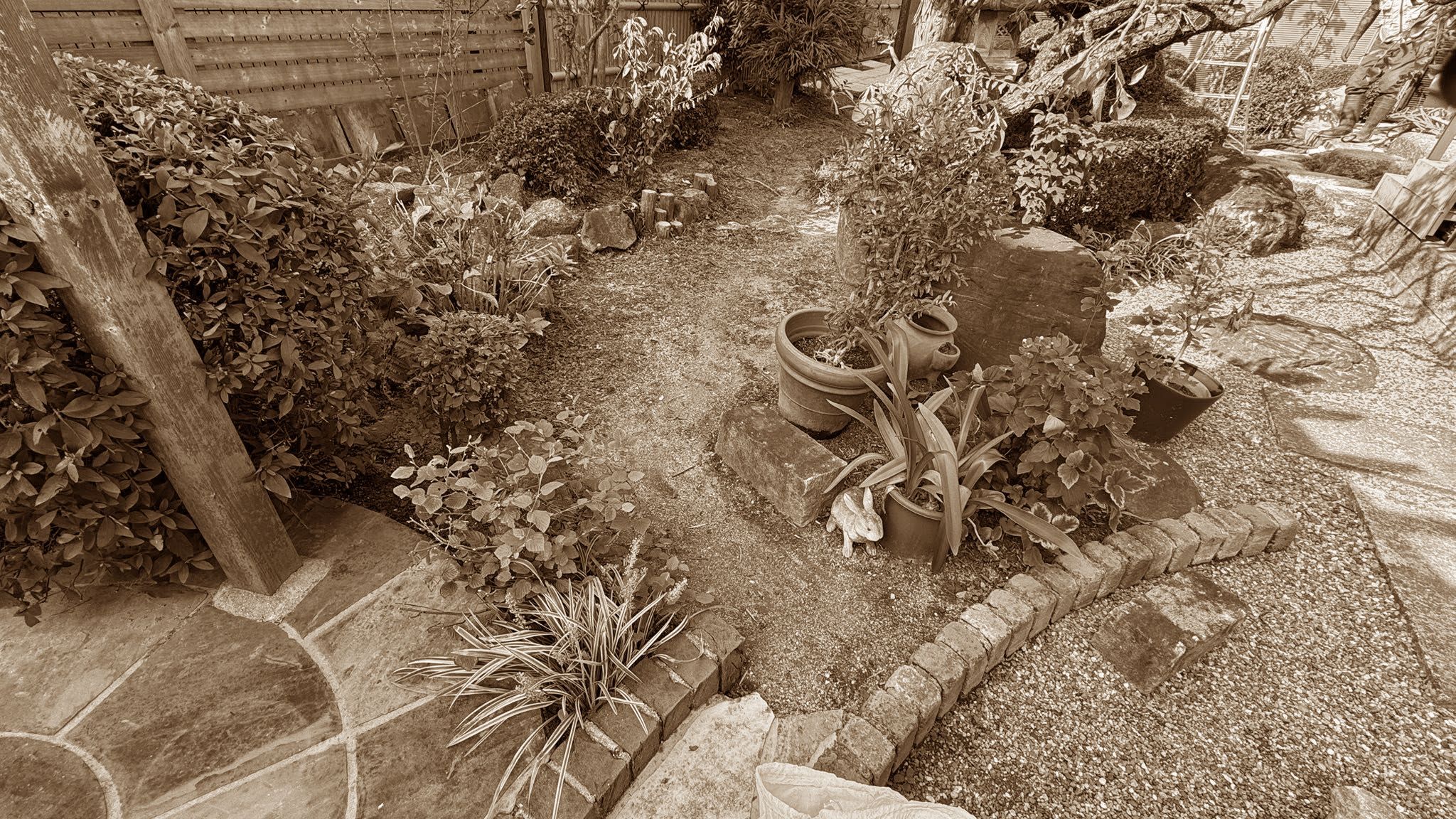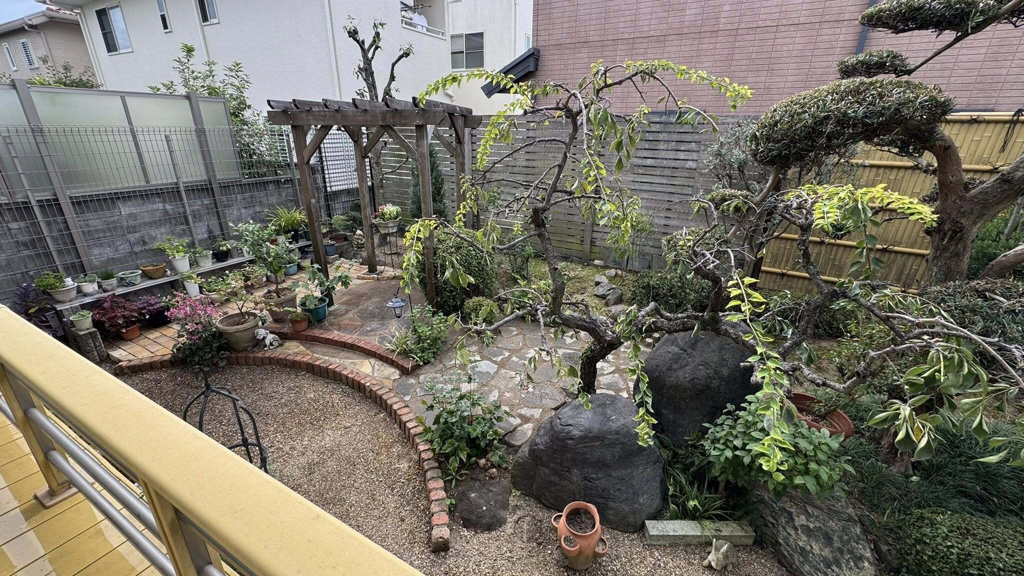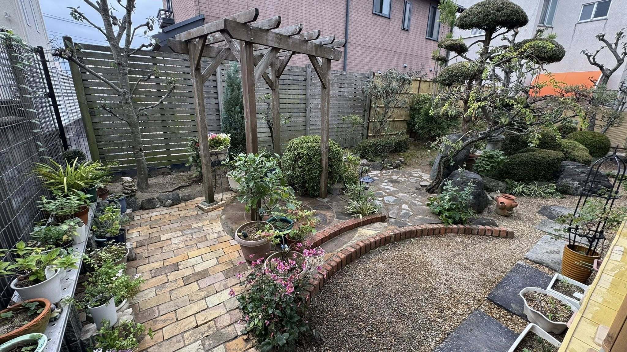 何度目かの庭園リフォームで藤棚として木製パーゴラを設置、会談と砂岩サークルを据えてアイストップとしました。今回は砂岩サークルより東側の鉢植えの花台との間の部分を砂岩敷き(200×100×厚50)にし、砂岩より西部分は和風エリアと連結部分になるため、和にもようにも見える、乱形極厚鉄平石敷きとしました。